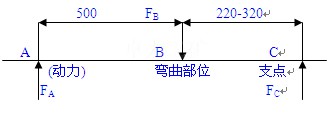 工作原理:本機體的一端為柱塞泵式液壓系統,另一端為活動頂頭11,中間設有鎖緊鉤梁13。工作時將機具放在需要校直(彎曲)的鋼軌上部。機具中部的鉤梁對準校直點,用直梁支桿12將機身支穩,然后往復擺動操縱桿,使柱塞泵1連續工作(吸、壓油),將高壓油壓入工作油缸2內,使活塞桿3外伸,油缸頂頭8在鋼軌左端A點處產生一推動力FA,再通過活動頂頭11在鋼軌右端C點處產生一約束反力FC,同時,中間鉤梁頂頭15,在鋼軌將要調直(彎曲)的部位B點處,又產生一約束反力FB(彎曲力),這樣根據杠桿平衡原理(三平行力平衡)可實現鋼軌的調直或彎曲。如圖示: